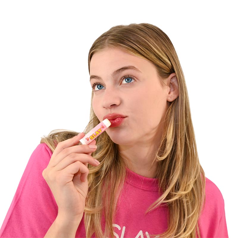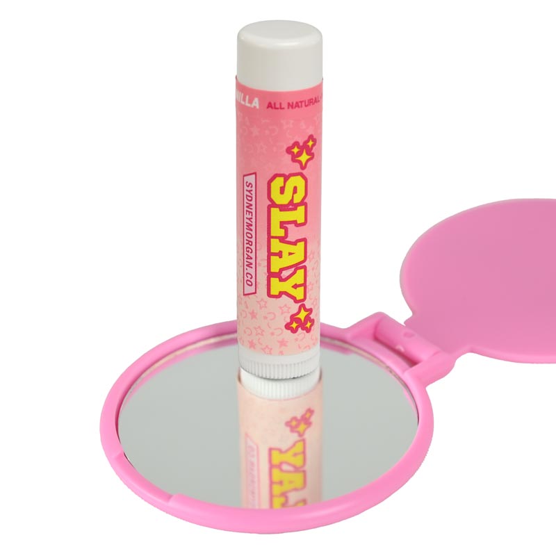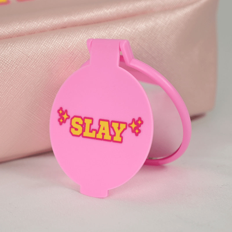 - Compact Mirror with "SLAY" logo decal branded on top, made of pink plastic with real glass mirror, functional flip design-can be propped on a desktop for easy use. It measuresΒ 2.8 x 2.4 inches closed.