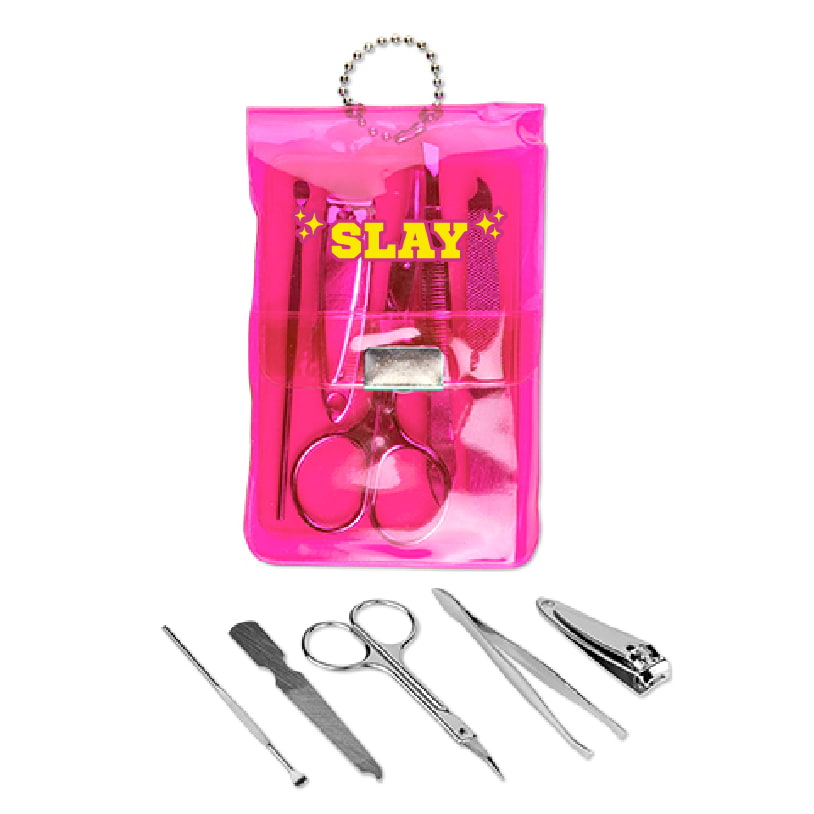 - Manicure Set in pink pouch measuring 4" x 2 3/4" which includes: tweezers, scissors, nail clipper, nail file & nail cleaning knife. Pouch has a bead chain attachment.